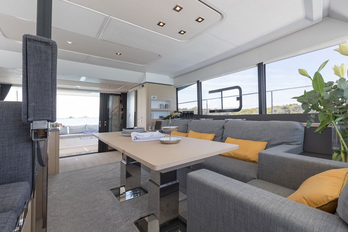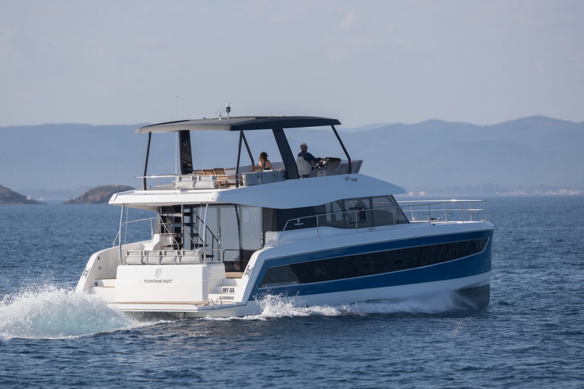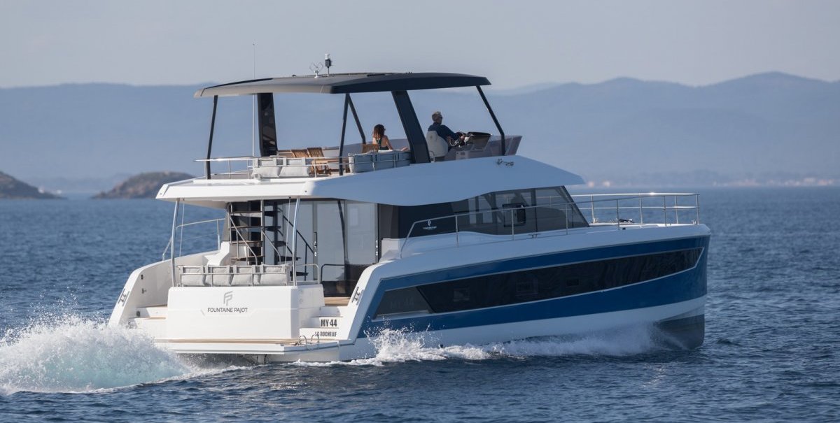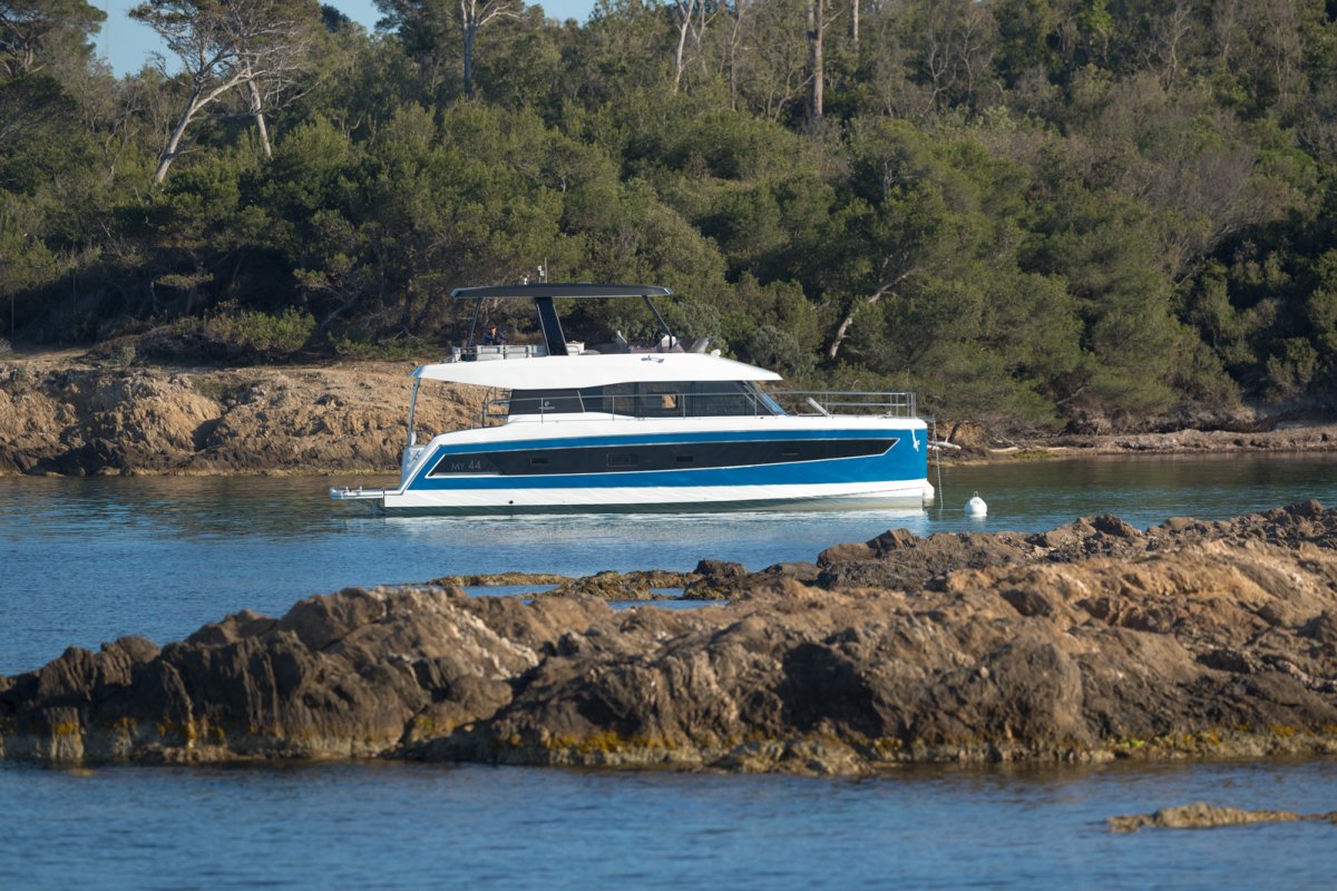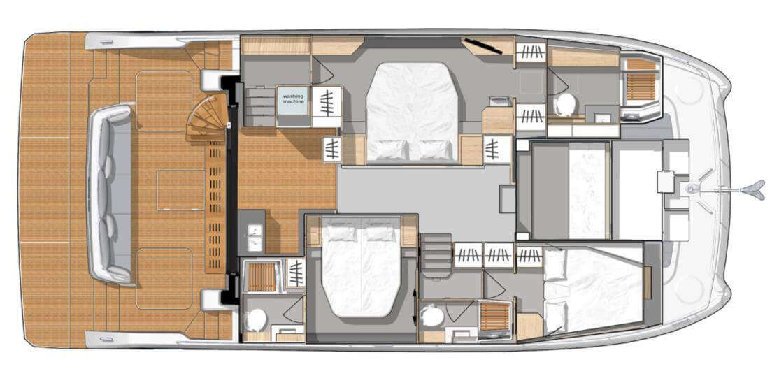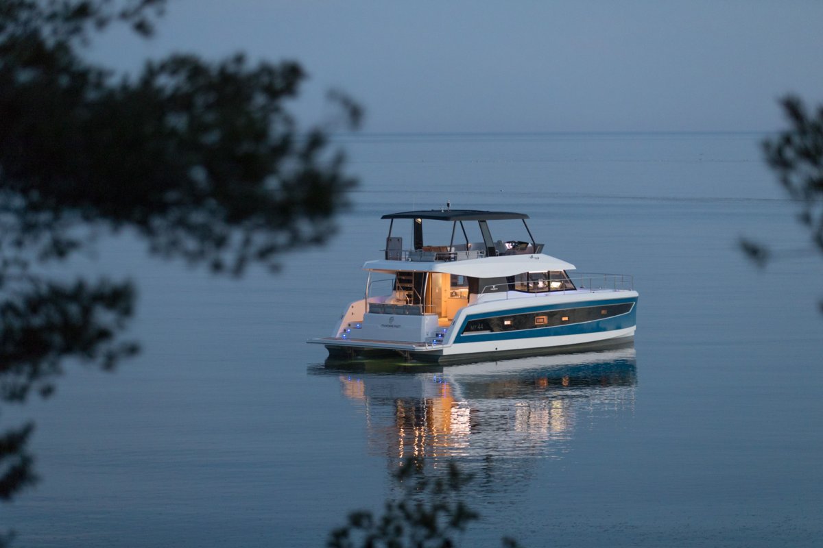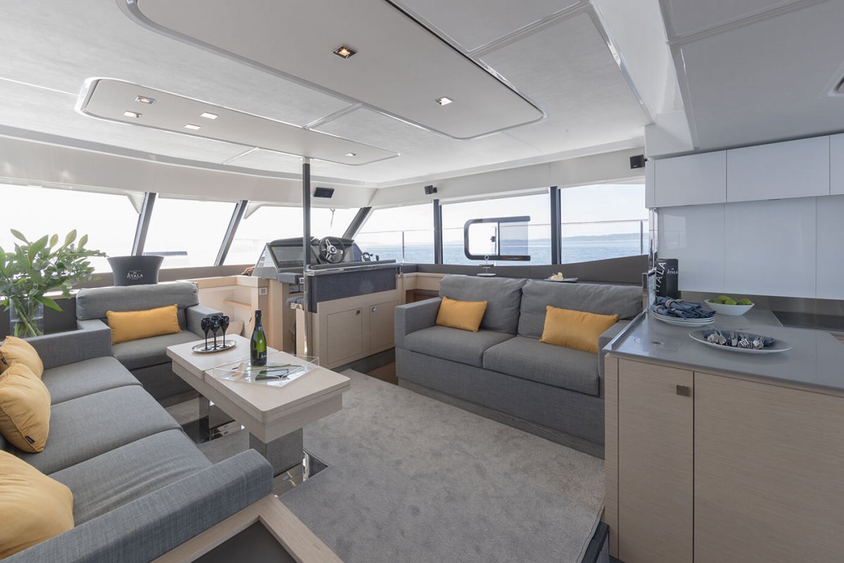 This new power catamaran has comfortable relaxation and reception spaces worthy of a second home. Savor memorable moments with family and friends on her enormous flybridge, designed with a sunbathing lounge, a galley and a real terrace or pool overlooking the sea. You will adore her saloon, a large open area with a terrace, spacious lounge and galley opening directly onto the cockpit, where you can enjoy outdoor activities all day long.